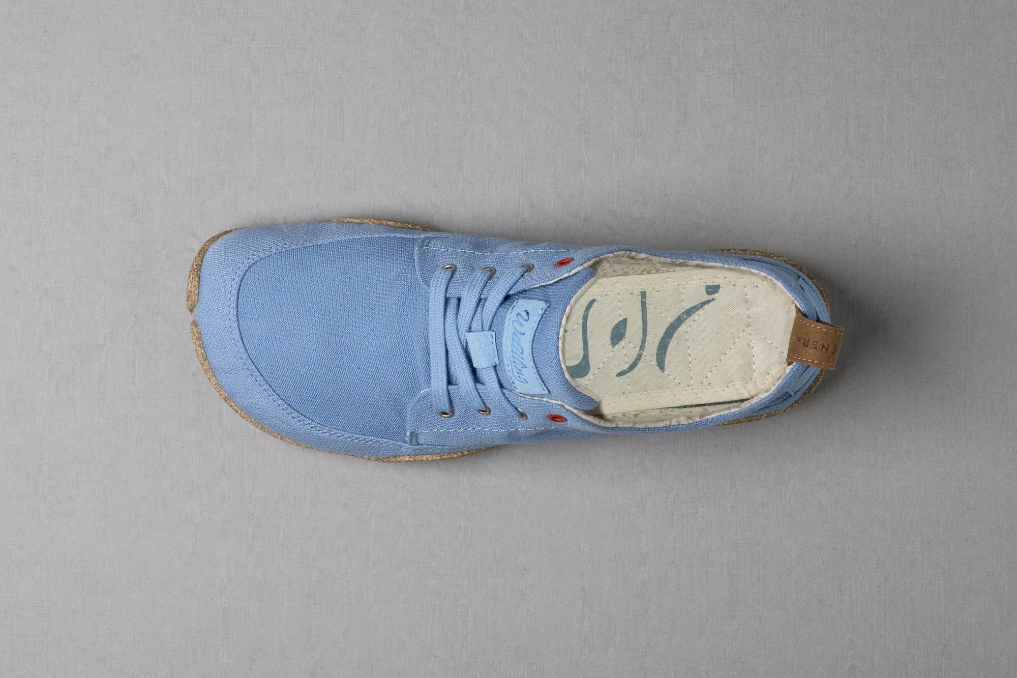 Nicht nur das Obermaterial, sondern auch der Ringbesatz dieses Minimalschuhs ist aus Baumwoll-Leinen-Gemisch gefertigt und erlaubt es uns, Mikrofaser einzusparen. Das strahlende Blau hat dabei seinen Namen inspiriert, denn Kul ist Kirgisisch und bedeutet See.