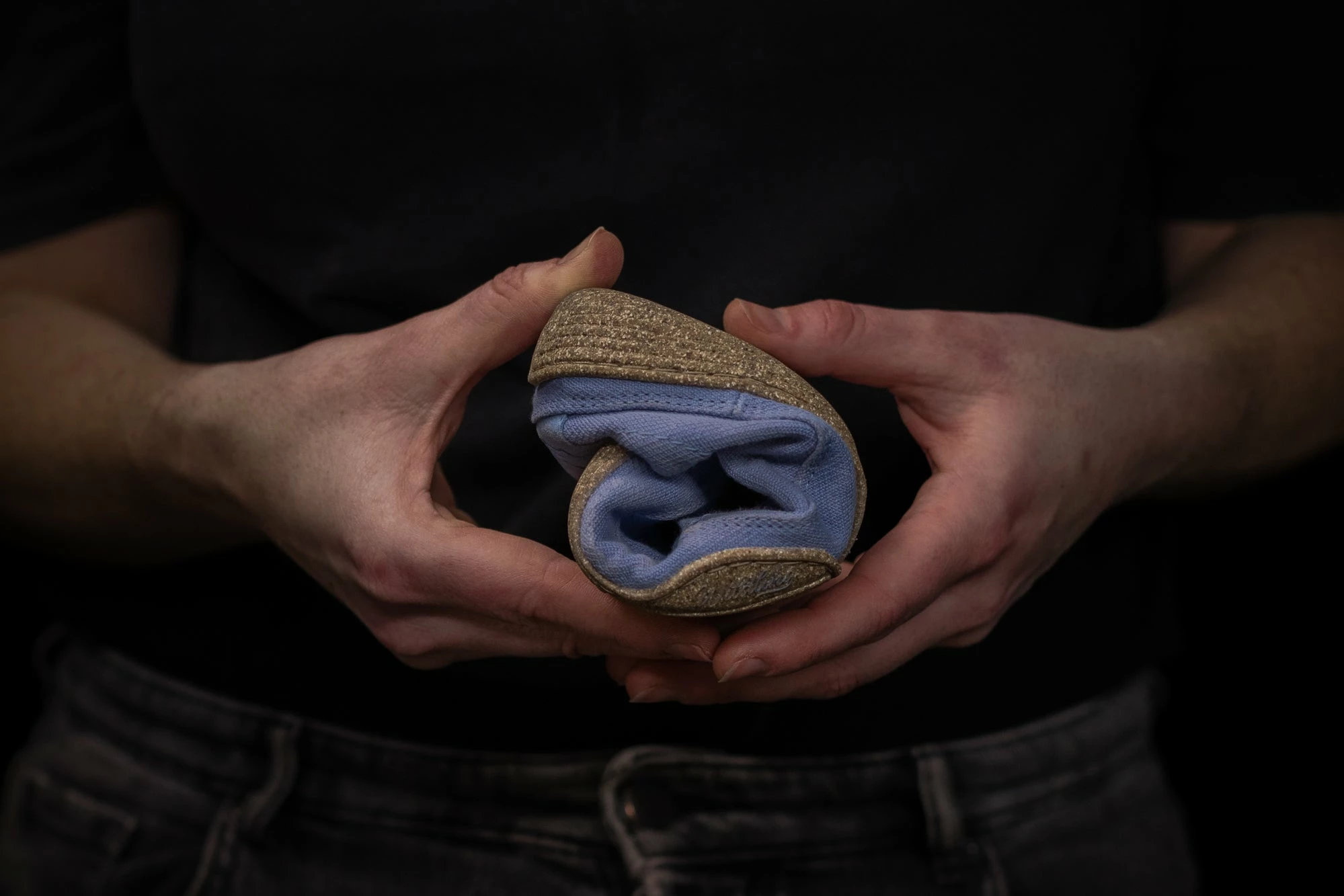 Die Materialien des himmelblauen Oberstoffes stammen aus kontrolliert biologischem Anbau. Das Leinen wird aus Europa bezogen und sorgt mit einem Anteil von 33 % zudem für ein angenehmes Fußklima.
